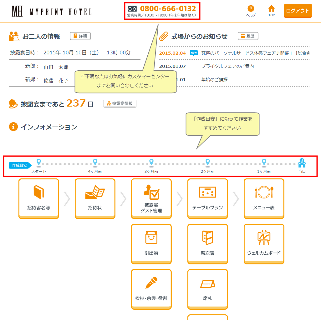 TOP画面では、お二人の登録情報を確認・修正したり、進捗状況や各種お知らせなどを確認することができます。