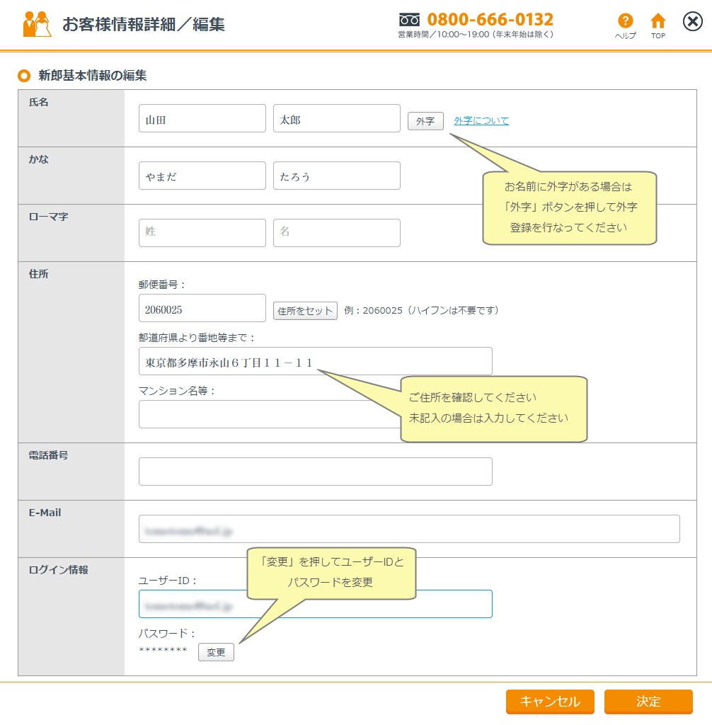 詳細ボタンを押すと、お二人の登録情報詳細が表示されます。空白の項目がある場合や修正がある場合は、情報の追加修正ができます。情報の入力が完了したら最後に決定を押してください。