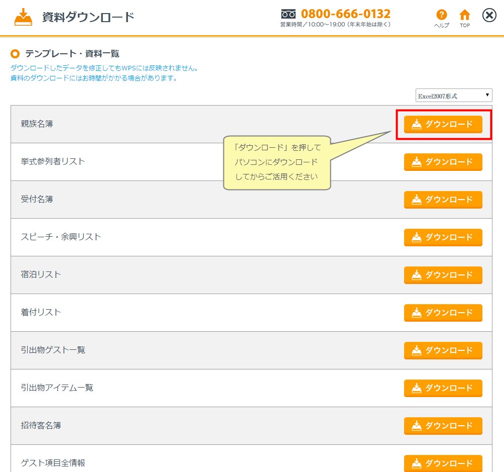 ご招待客の基本情報をはじめ、登録した様々なゲストに関わる情報や引出物情報をExcelのデータとしてダウンロードができます。年賀状ソフトなどへの住所録一括取り込みにも活用できるCSVファイル「ゲスト項目全情報」もご用意しておりますのでぜひご活用ください。Excel2003をご利用の場合は形式を切り替えてからダウンロードしてください。