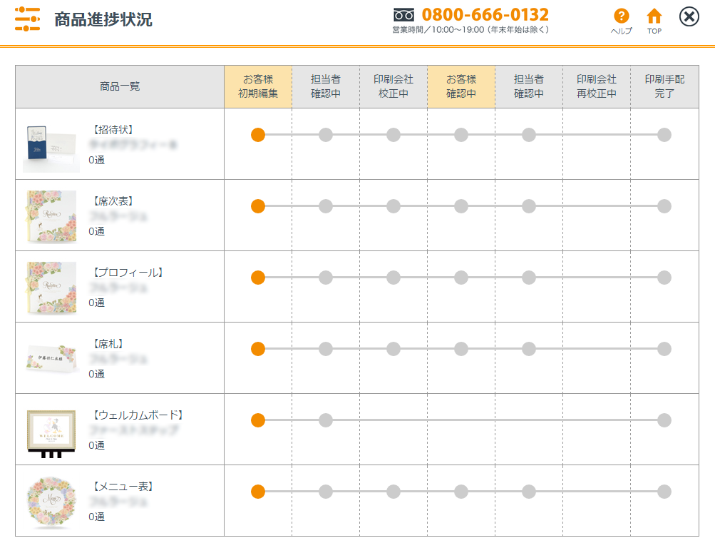 ペーパーアイテムの進捗状況を確認できます。「お客様確認中」が点燈している場合は校正紙の確認ができますので必ずチェックしてください。※「校正紙」とは・・・招待状や席次表などを商品として印刷する前にご確認いただく下刷りのことをさします。ウェディングパートナーシステムではPDFで表示されますので必要に応じて印刷してください。