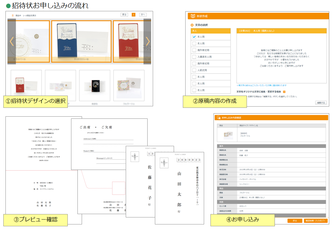 ①デザインタイプの選択→②原稿内容の作成③プレビュー確認→④お申し込み→⑤校正確認→⑥修正→⑦印刷手配