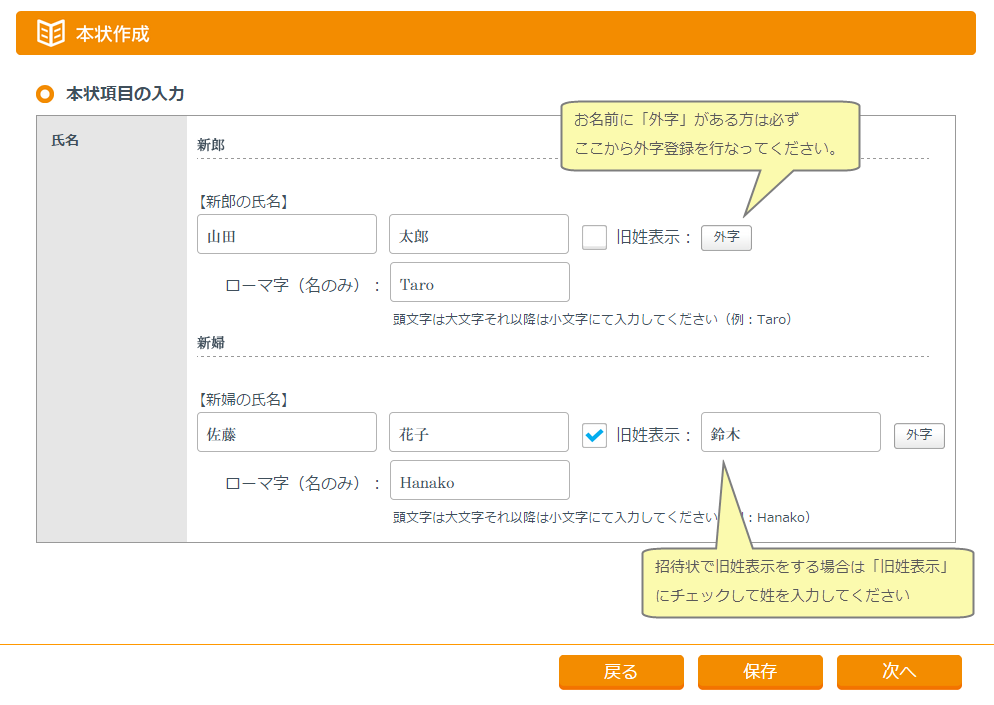 おふたりの氏名とローマ字を入力します。挙式主催者にご両親が入る場合はご両親の氏名も入力します。氏名に外字(お使いの端末で変換できない漢字)がある方は「外字」ボタンを押して外字設定してください(外字の登録方法はヘルプの外字項目を参照してください)
