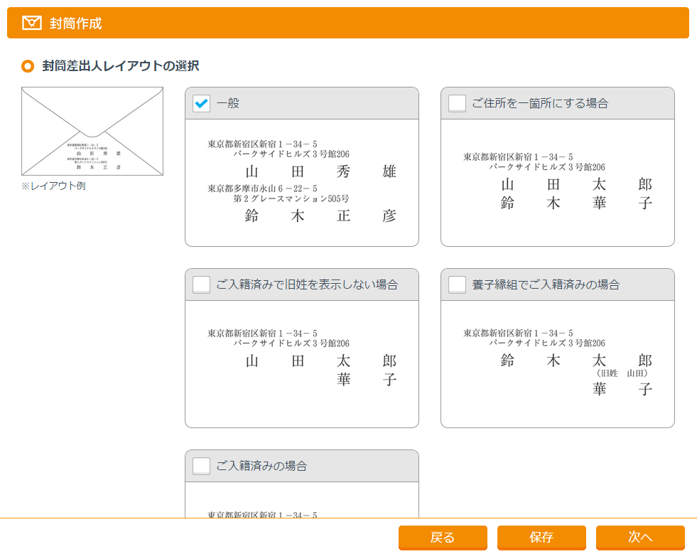 封筒差出人レイアウトの選択選択肢の中から封筒裏面の差出人印刷レイアウトを選択します。選択した文章に見合った差出人のレイアウトを選んでください。