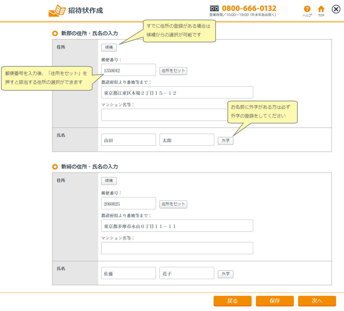 選択した差出人レイアウトに合った入力項目が表示されますので差出人の住所と氏名を入力してください。