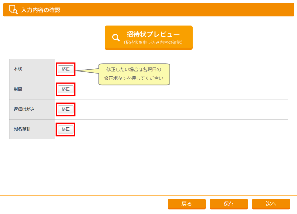 プレビューでの確認後、修正がある場合は本状・封筒・返信はがき・宛名筆耕それぞれの「修正」ボタンをを押して修正してください。修正後は保存したのち内容確認画面に戻って、再びプレビューで確認してください。