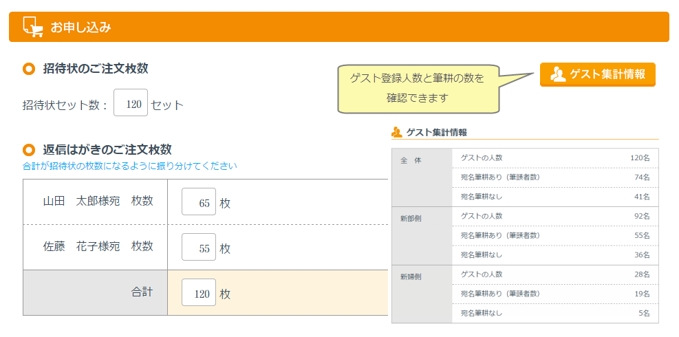 ※「ゲスト集計情報」を選択すると新郎新婦それぞれのゲスト登録数が参照できますので、返信はがきの枚数振り分けに便利です。
