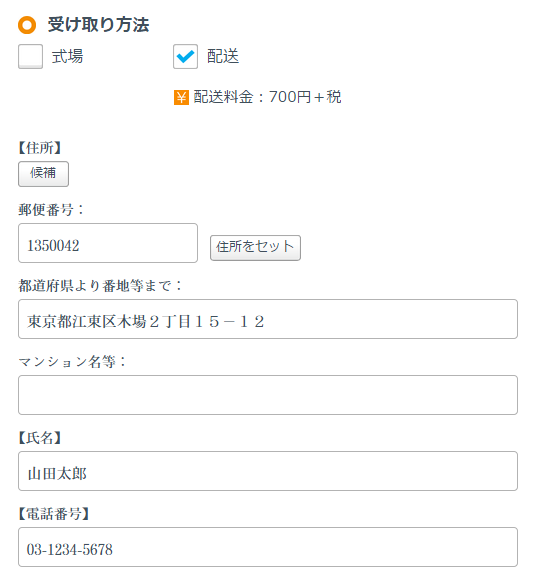 出来上がった商品(招待状)のお受け取り方法を選択してください。配送でのお受け取りをご希望の場合は「配送」にチェックしてお受け取り先の情報を入力してください。
