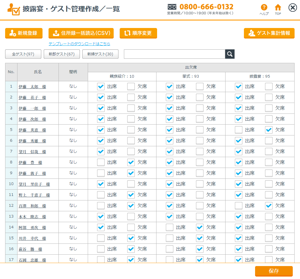 TOPから「披露宴ゲスト管理」を選択するとゲスト一覧画面が表示されます。ここでは、ゲストの新規登録、ゲストの出欠席管理及び披露宴情報などの登録と変更が可能です。