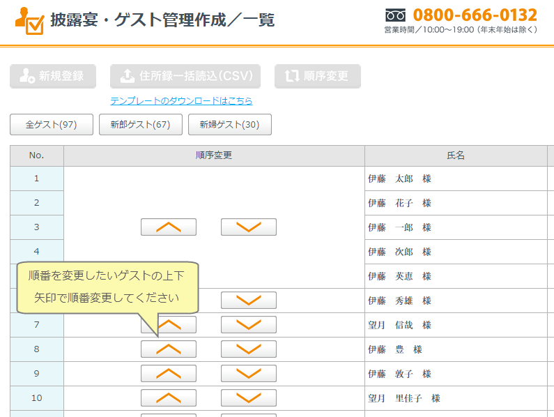 ゲスト一覧画面での表示順序を変更したい場合は「順序変更」を選択します。順序を変更したいゲストの矢印で上下を指定して順序を変更してください。最後に「保存」を押してください。順序が保存されてもとの画面に戻ります。