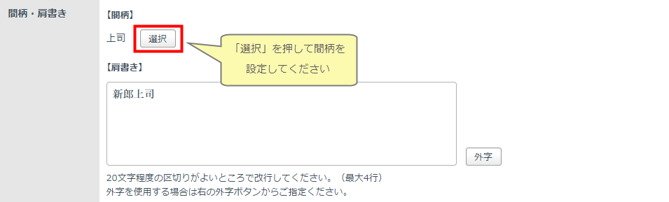 間柄で「そのほかの方」を選択した場合のみ、肩書きは自動入力されません。適宜入力してください。