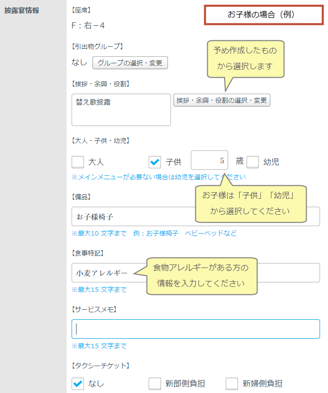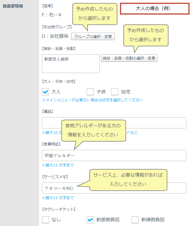 サービスメモ・・・披露宴でのサービス上で注意すべきことがあれば記載してください。記載例:アルコール不可