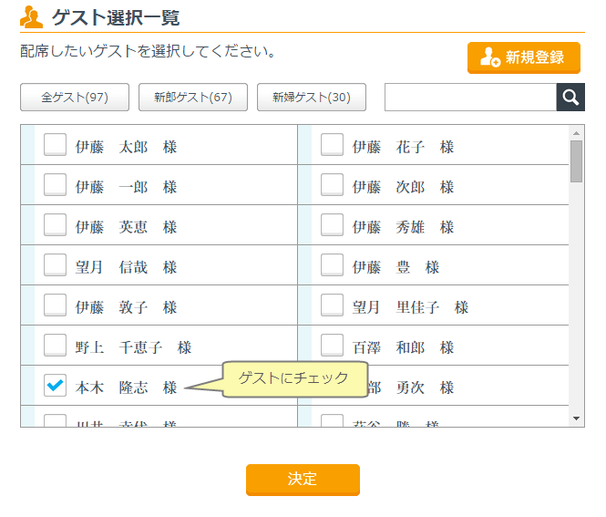 TOPから「テーブルプラン」を選択して「配席画面を表示」を押します。次に、ゲストを配席したい枠を押します。登録されているゲストの一覧画面が表示されますので配席したいゲストにチェックして「決定」を押すともとの配席画面に戻り、指定した位置にゲストが配席されます。