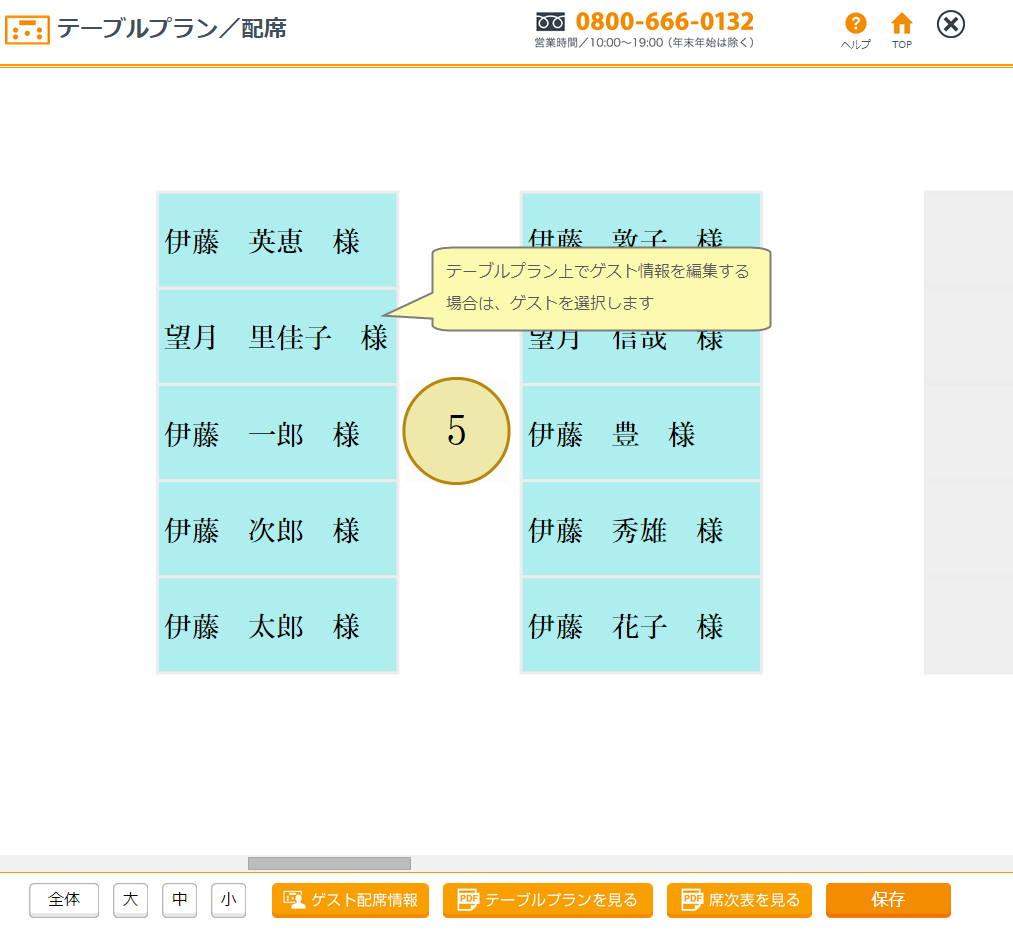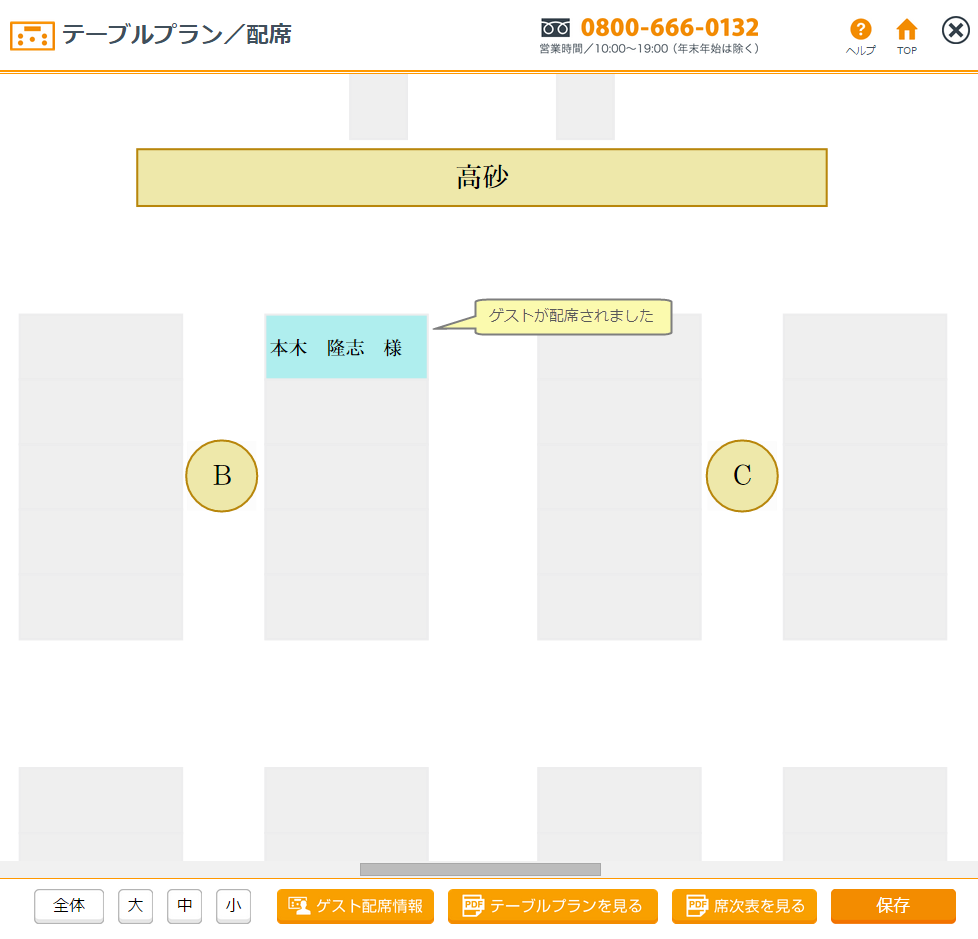 テーブルプランレイアウトが設定されていれば、ゲストの配席が行なえます。