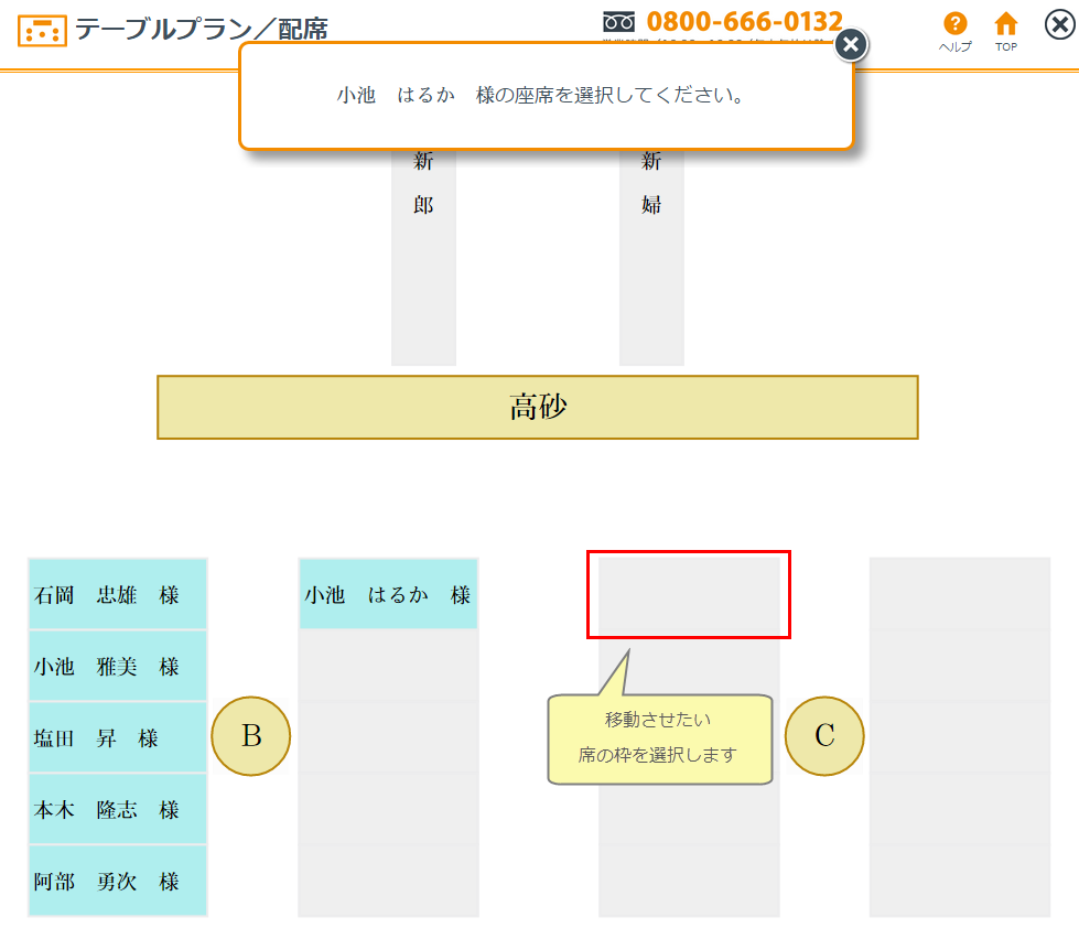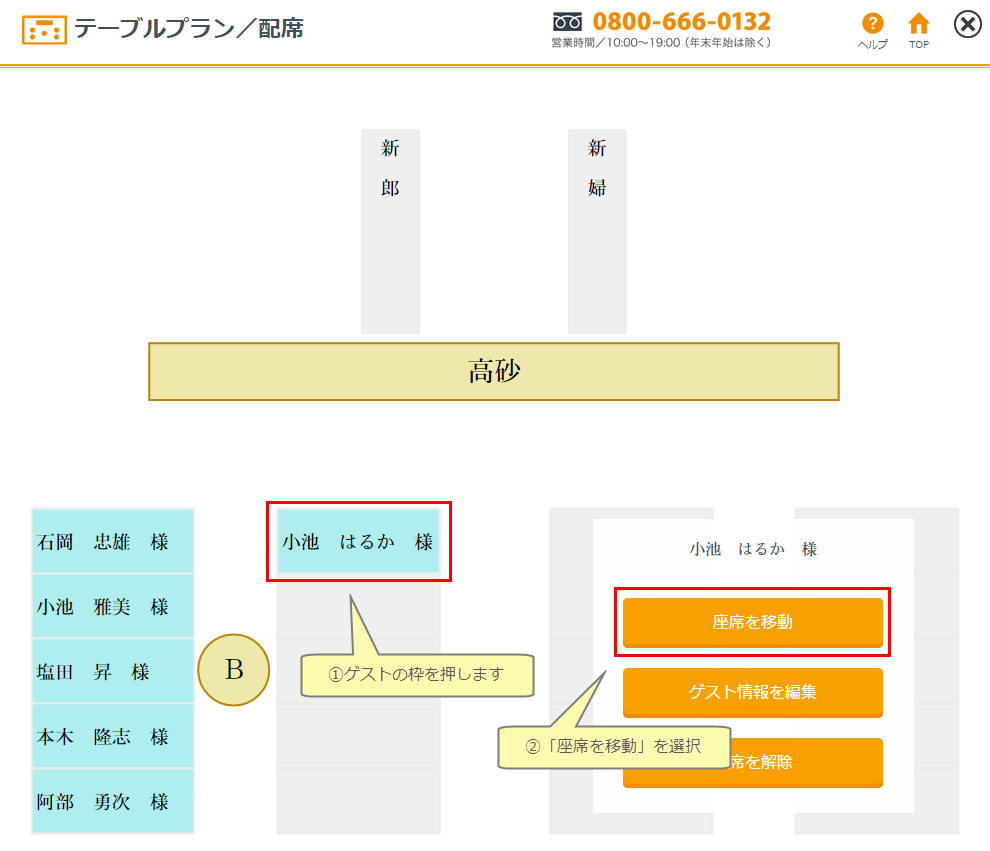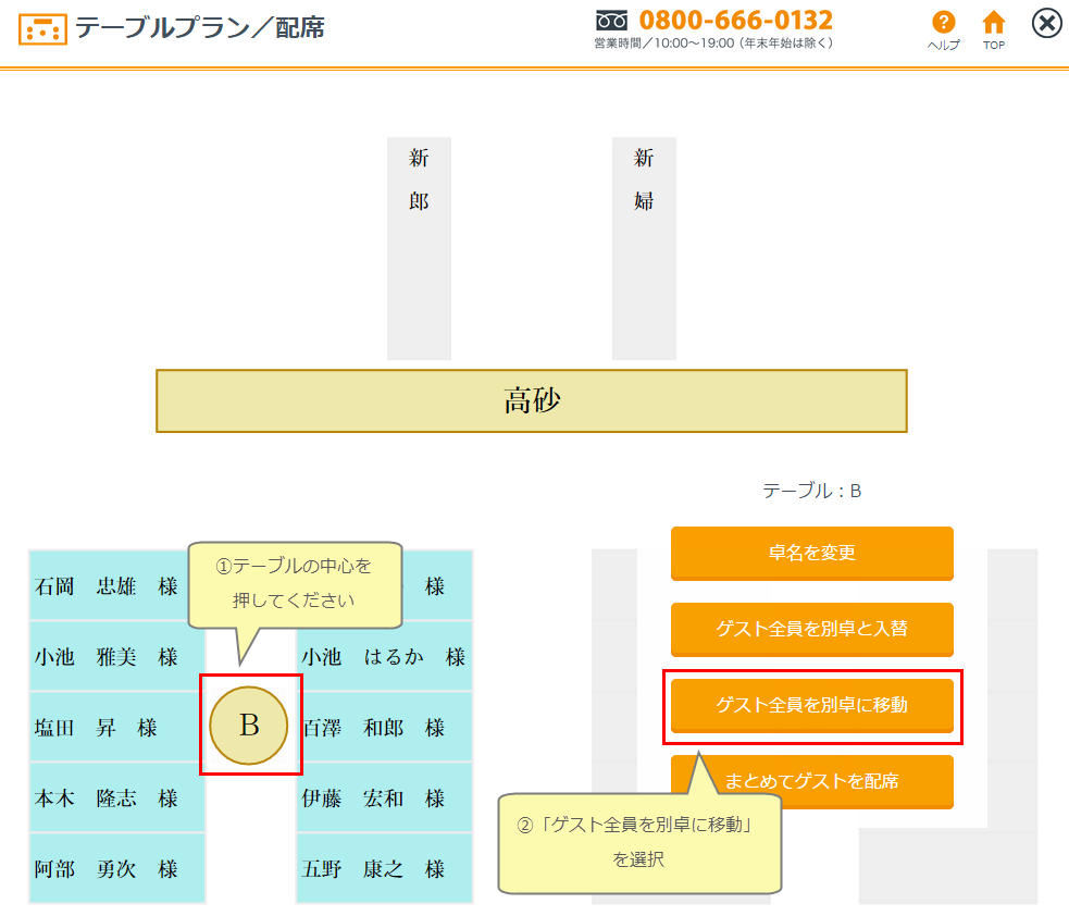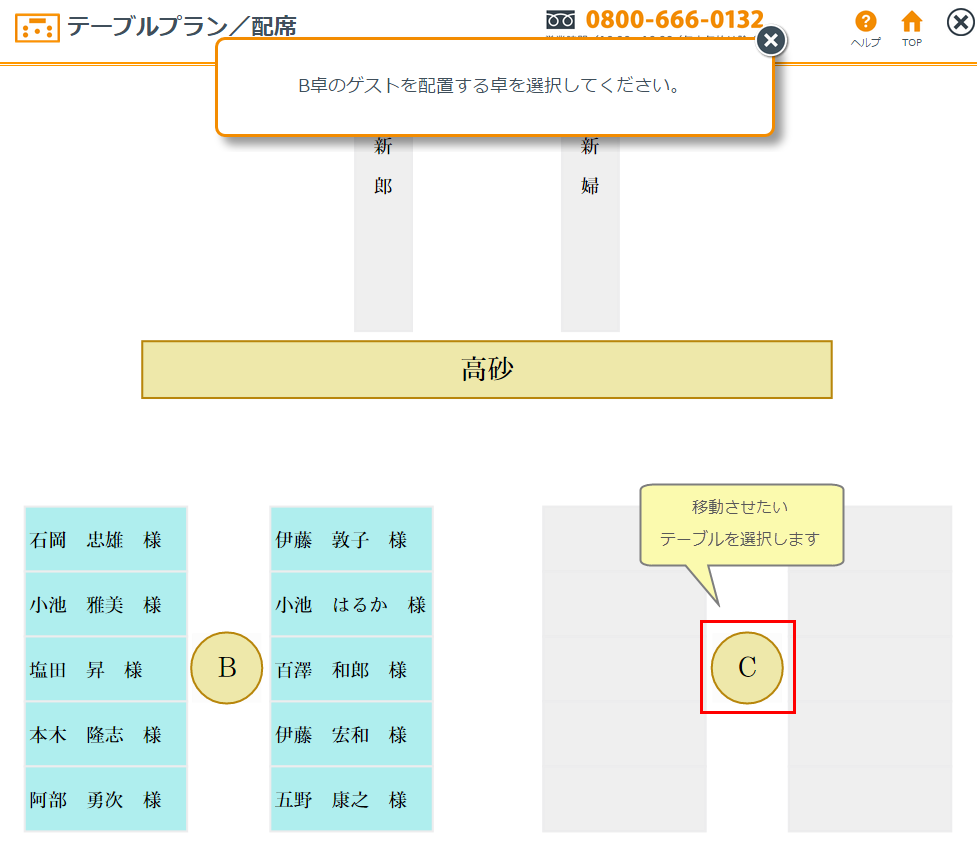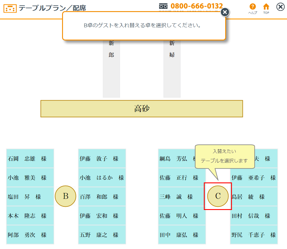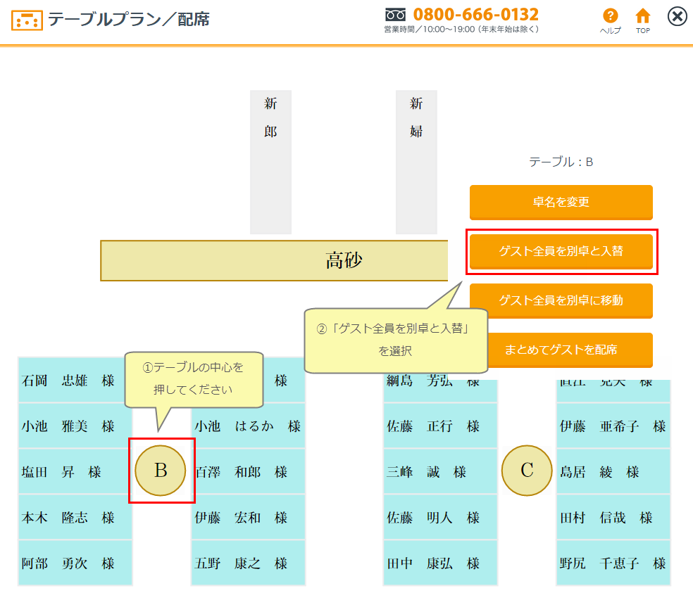 ※双方の配席枠の数が異なっている場合は、配席枠をオーバーしたゲストを表示しますので入替先のゲストを削除するなどしてから再度移動してください。