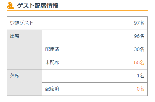 現在の配席情報を確認するには「ゲスト配席情報」を選択します。登録済みゲストの合計と配席済み・未配席、また欠席の人数も表示します。