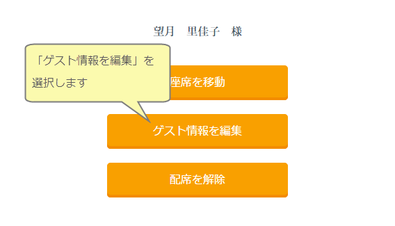 配席を行なっている時に、ゲストのお名前や登録情報を確認したり修正する場合は配席画面からゲストの氏名を押して「ゲスト情報を編集」から確認・修正ができます。