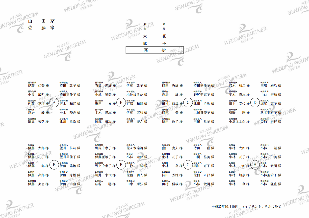 下記の図をご参考にしてください。また、席順について事前にご両親や式場担当者とご相談・お打ち合わせいただくと作業がスムーズとなります。