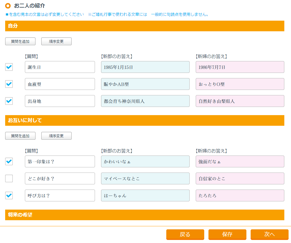 WPSでは、プロフィールの内容作成(原稿)とお写真をご用意いただければ、簡単にお申し込みをいただくことができます。プロフィールは席次表の配席面裏側に印刷します。ご披露宴開始までの待ち時間、あるいは披露宴中にゲストの皆さんにお二人のことをもっと知っていただくことできっと披露宴も盛り上がります。入力項目には一般的な例が入っているため迷うことなく作成できます。質問の内容は変更したり追加もできますので、おふたりのオリジナルにすることもできます。