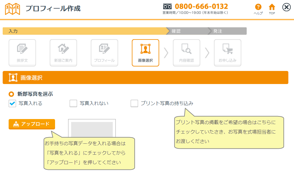 プリント写真のお持込みの場合は、「画像選択」時に「プリント写真の持ち込み」にチェックしてください。お写真は式場担当者にお渡し願います。