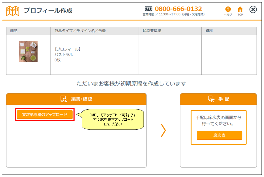 プロフィールに掲載する「宴次第原稿」をアップロードすることができます。こちらは担当者の作業になりますので、お客様の作業は不要です。