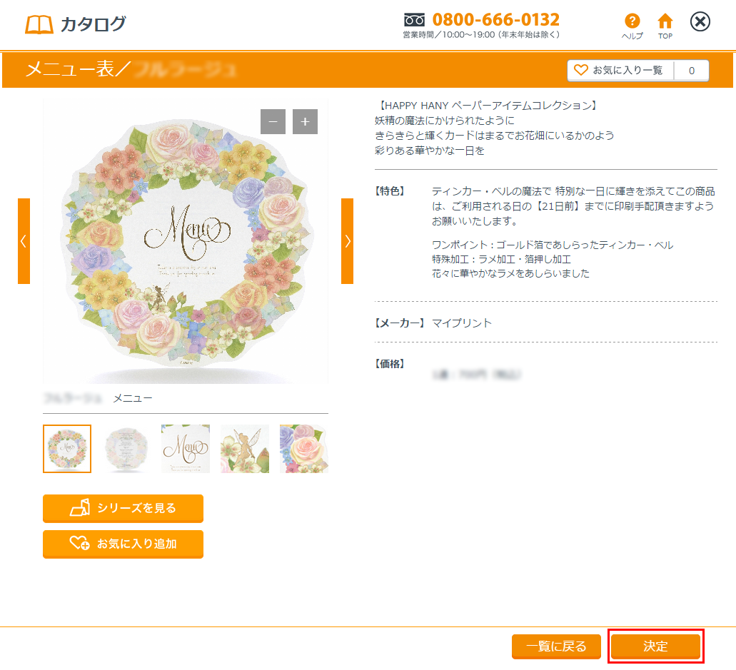 お気に入りのデザインが決まったら商品画像を選択してください。詳細を確認したら「決定」を押してください。