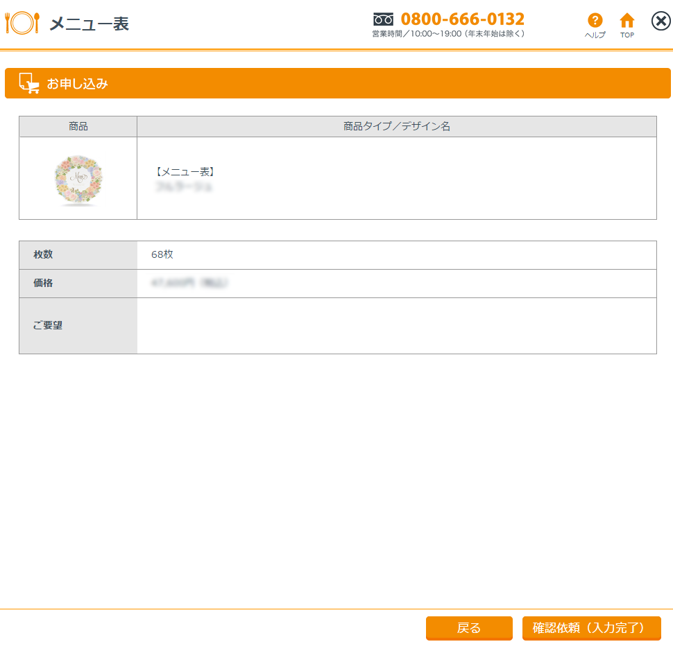 メニュー表のデザインタイプ・枚数・ご要望を確認したら、「確認依頼」を押してください。