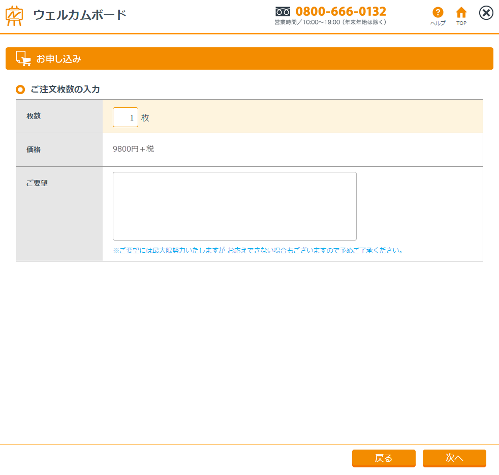 ウェルカムボードのご希望枚数を入力してください。ウェルカムボードの印刷などについてご要望がある場合はご要望欄にご記入ください。