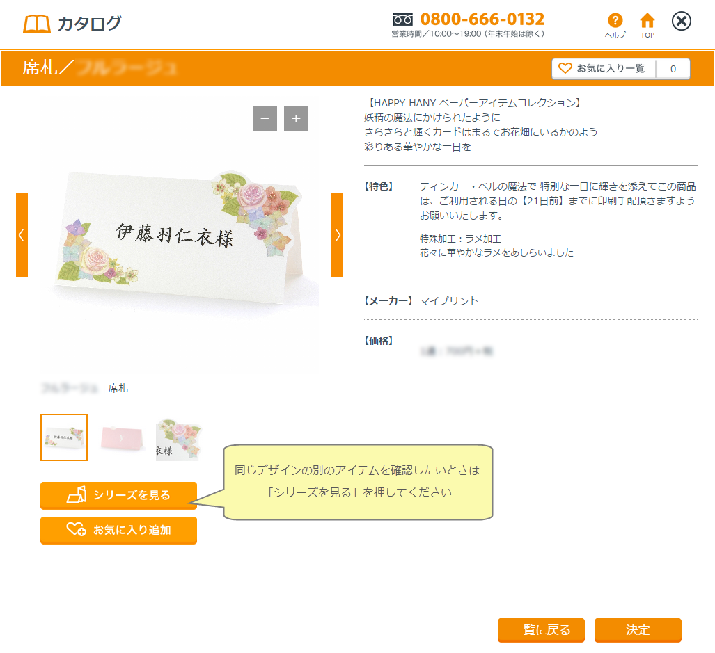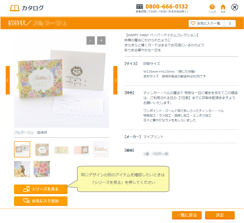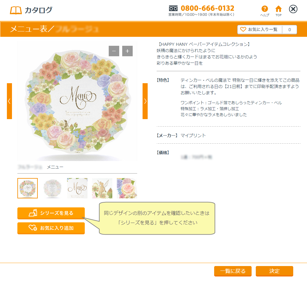 ご覧いただいているデザインで良い場合は「価格」表示欄で商品タイプにチェックして「決定」を選択します。