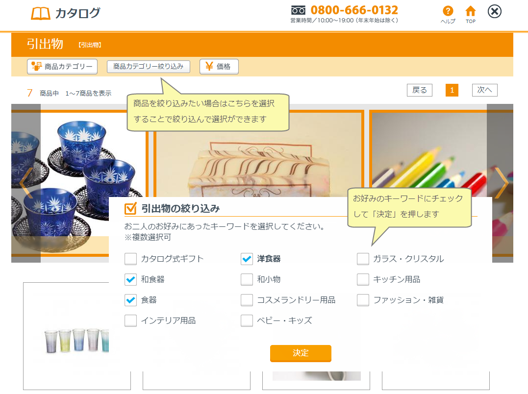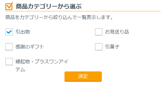 引出物を選択するには、「商品カテゴリー」から探したい商品のカテゴリーを選択します。ご希望のカテゴリーにチェックして(複数選択可能)から「決定」を押すと、選択したカテゴリーの商品が表示されます。