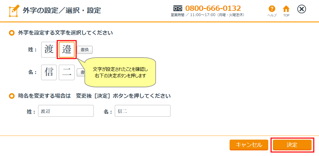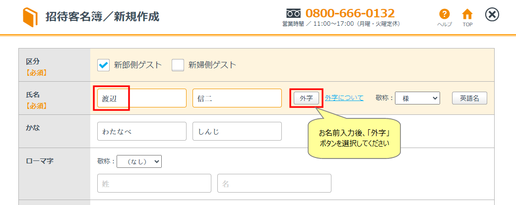 ゲストのお名前に「外字」がある場合は、必要に応じて外字設定をしてください。外字とは、旧漢字、環境依存文字などの文字のことを言います。