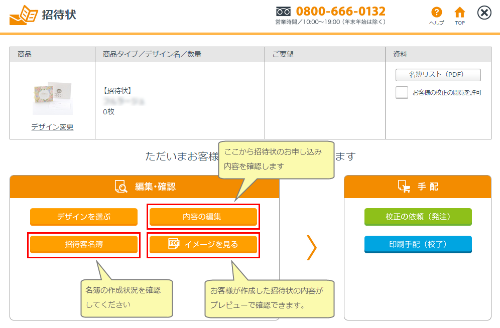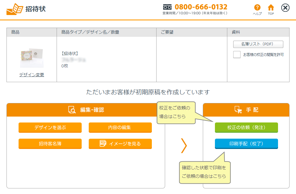 ①お客様の招待状確認依頼メールが届く→②WPSにログインして入力内容の確認→③名簿入力のご確認(筆耕ありの場合)→④校正のご依頼→⑤校正確認→⑥お客様・担当者による修正・確認→⑦印刷手配