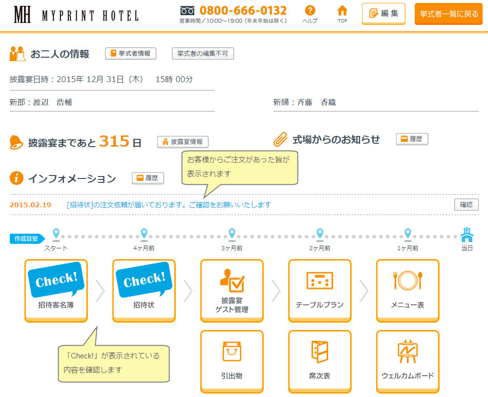 お客様側で招待状の内容編集と名簿作成が完了すると、ご担当者への確認依頼を行ないます。ご担当者には確認依頼があった旨のメールが配信され、挙式者一覧画面でも表示されます。