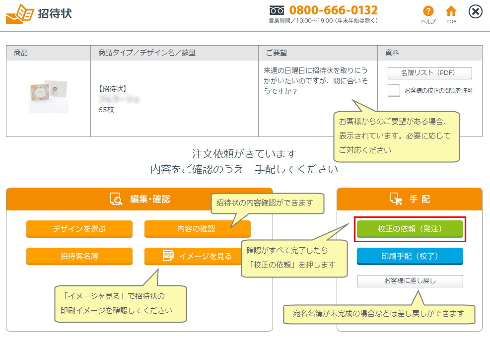 お客様TOP画面>招待状>校正の依頼