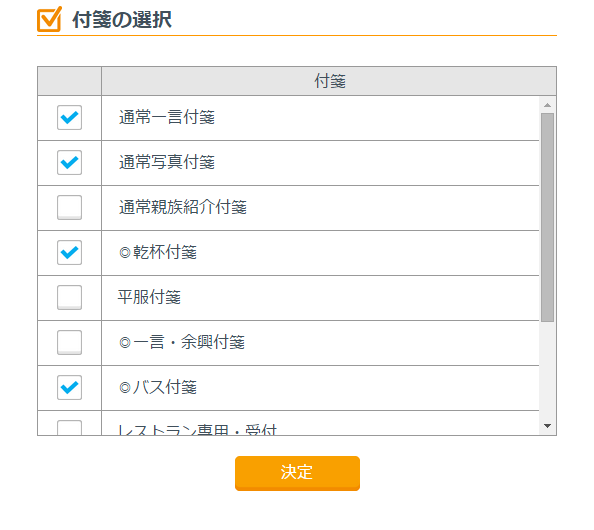 「付箋を選択」を押して必要な付箋を選択してください。選択後「決定」を押すと枚数と時間等の入力画面が表示されますので入力してください。