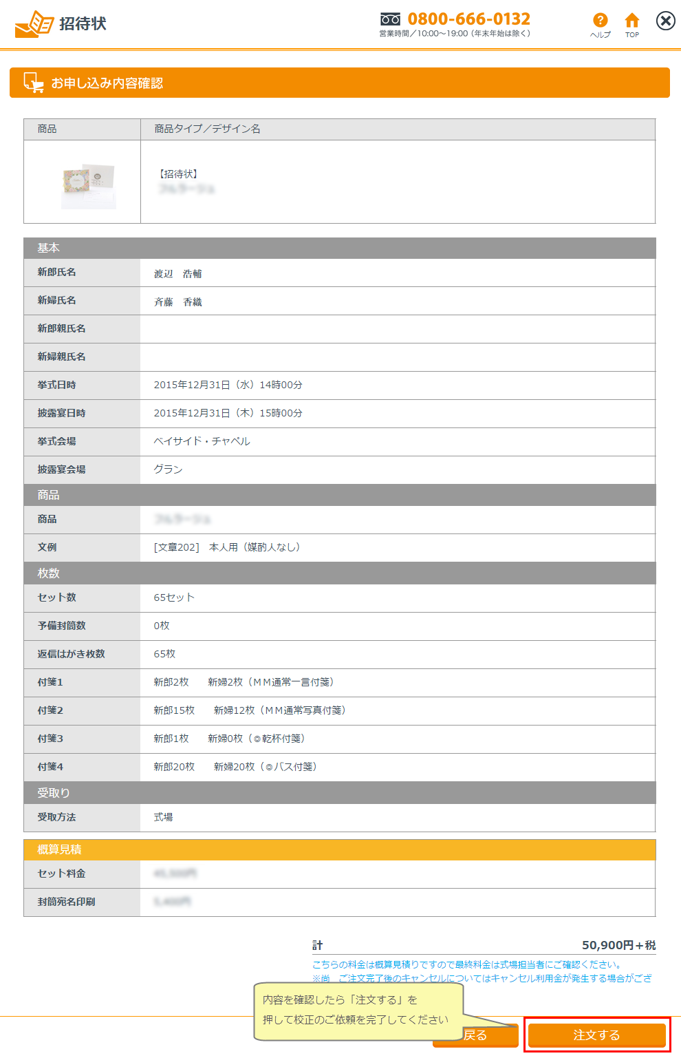 お客様が作成した招待状の内容確認・名簿確認が済んだら、招待状のお申し込みを行なってください。