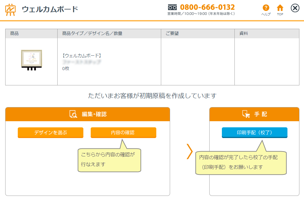 ここまでをお客様が編集後、ご担当者様への確認依頼を行ないます。ご担当者様にはWPSからメールでのご連絡が届きますのでお客様情報画面から「ウェルカムボード」を選択して内容を確認してください。⑤内容に問題がなければ校了(印刷手配)を選択してください。